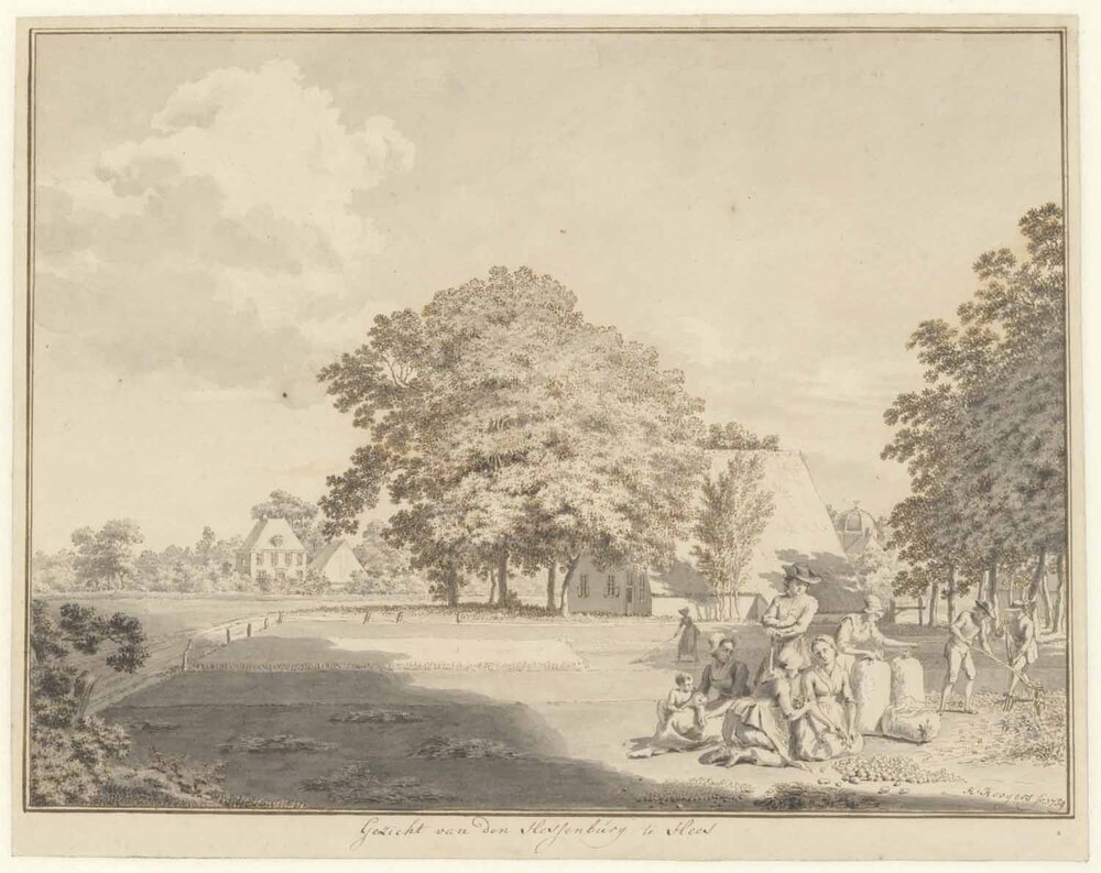 Het is mogelijk dat Hoogers zijn figuren op verschillende tekeningen gebruikte. Één van de figuren die rechts het land bewerken lijkt bijvoorbeeld in spiegelbeeld te zien op een tekening die hij in 1790 maakte van Zuylen aan de Vecht. Op deze tekening heeft de man dan wel geen hark maar een touw vast, maar de houding en hoed komen precies met elkaar overeen. Ook andere figuren in de groep doen denken aan die op andere werken van Hoogers. Het moge dus duidelijk zijn dat hij de figuren op tekeningen als deze niet naar het leven tekende, zoals hij de rest van de tekening deed, maar vermoedelijk toevoegde om de compositie interessanter te maken. De aanwezigheid van figuren maakt dat ook de toeschouwer zichzelf voor kan stellen in het landschap.