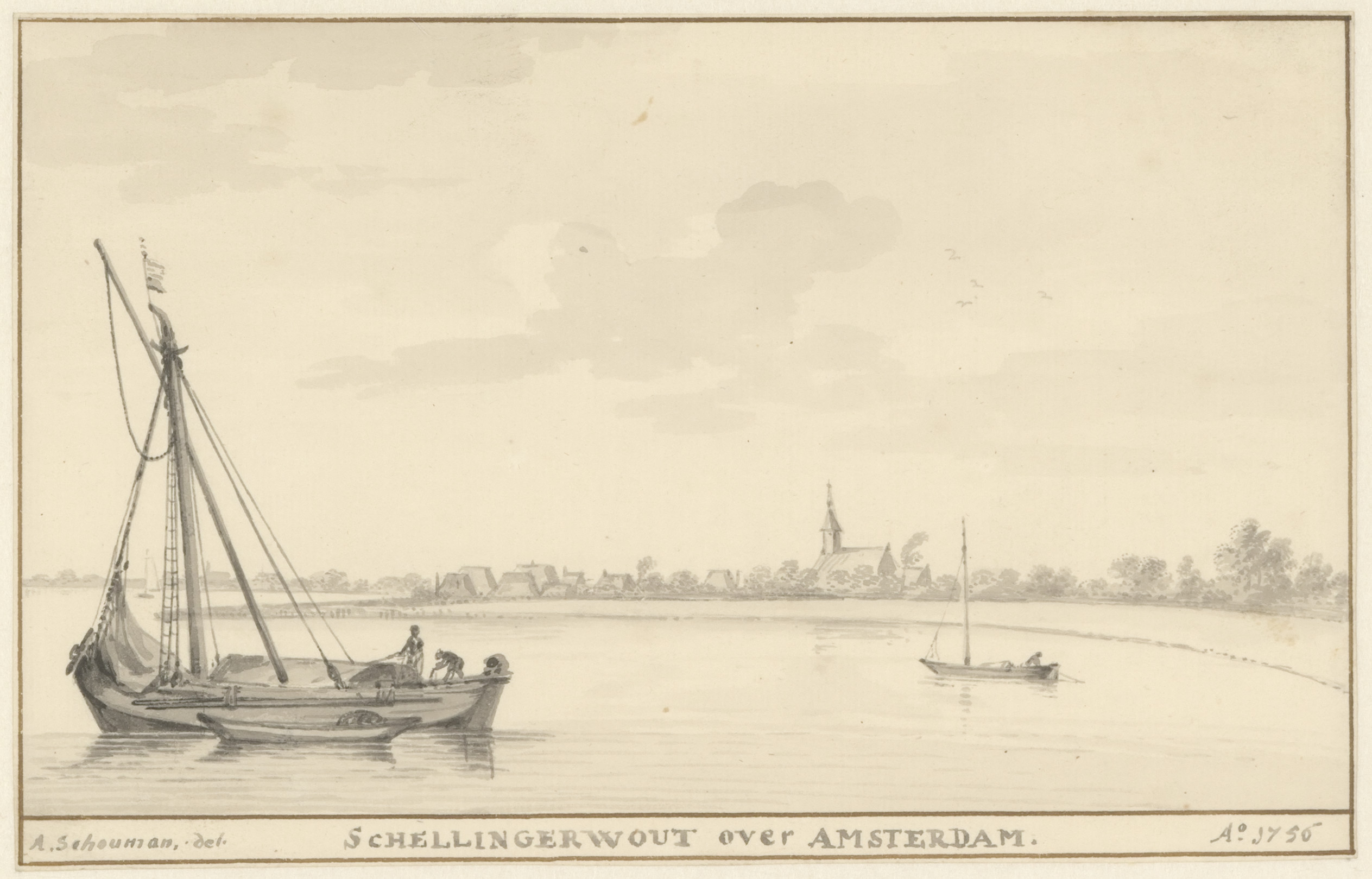 Deze tekening met het profiel van het dorpje Schellingwoude, ten noorden van Amsterdam aan de overkant van het IJ, behoort tot de weinige afbeeldingen die Schouman in de omgeving van Amsterdam vervaardigde. Hij tekende het profiel nogmaals, zestien jaar later, op 27 september 1772, vanuit een iets ander standpunt. ( Ingrid Oud)