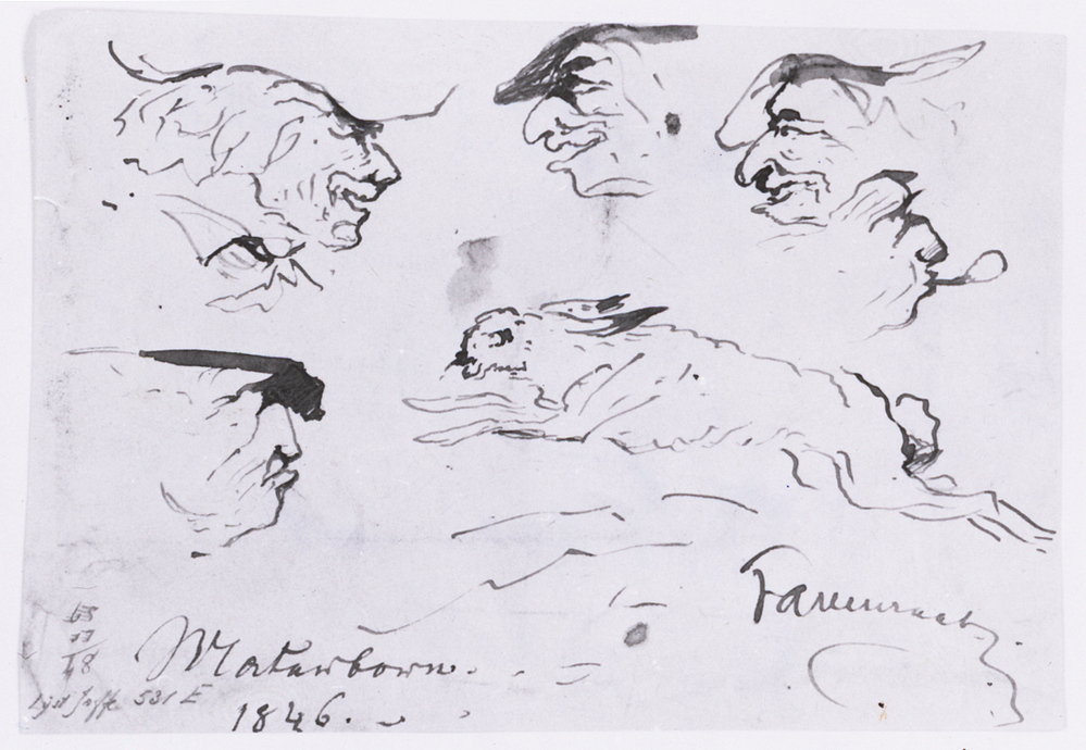 - Schetsen van vijf hoofden en een haas. Studie van twee hazewindhonden (verso), 1846