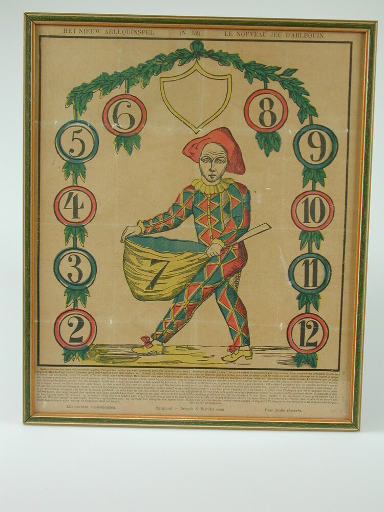 Afgebeeld is figuur in harlekijnspak en muts, met zak in handen waarop getal 7 gedrukt. Aan bovenzijde prent staat titel van spel in Nederlands en Frans met daartussen merk no. 52. Daaronder hangt dakvormige bladerkrans boven hoofd van harlekijn. Ter linkerzijde aan bladerkrans hangen getallen 2 tot en met 6 in cirkels. Ter rechterzijde hangen getallen 8 tot en met twaalf in cirkels. Onder beeld staat tekst waarin uitleg van spelregels: links in Nederlands, rechts in Frans.