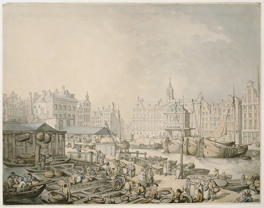 - De vismarkt bij de Dam te Amsterdam met het Stadhuis en de Waag op de achtergrond, 1786 - 1827