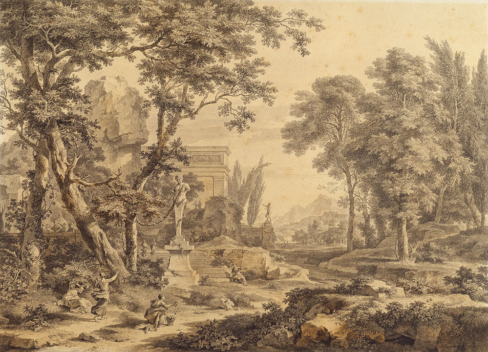 Een schets door Jan van Huysum toont eveneens een arcadisch landschap met een beeld van Priapus; de compositie wijkt echter af van de tekening in het AHM.