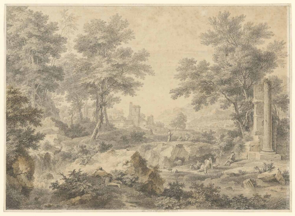 De amateur-tekenaar Johannes de Bosch (1713-1785), die het werk van Jan van Huysum vaak als voorbeeld nam, gebruikte onderdelen van deze Amsterdamse tekening voor zijn eigen arcadisch landschap (afb. a). Hij kopieerde de waterval en de man die naar de waterval ligt te kijken. ( Ingrid Oud)