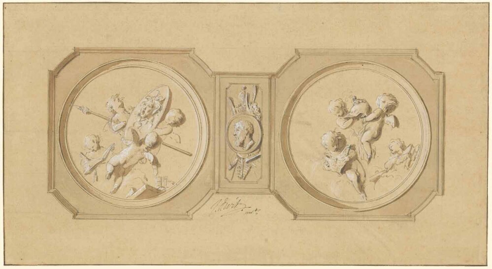 Het ontwerp is verdeeld in twee medaillons en een tussenstuk. In het linker medaillon dragen drie putti een schild met het hoofd van Medusa en een speer, beide attributen van Minerva, de beschermvrouwe van kunst en wetenschap. In het rechter medaillon dragen drie putti de helm en het harnas van Minerva. Het rechthoekige tussenstuk toont een medaillon met de kop van een man. De lier, panfluit, gekranste herdersstaf en de schilderstok, die onder het medaillon zijn te zien, verwijzen naar Apollo als beschermer van de po‰zie en muziek. ( Leonoor van Oosterzee)