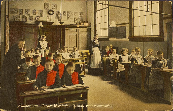 In het Amsterdamse Burgerweeshuis konden kinderen van Amsterdamse poorters (burgers met rechten om in de stad te wonen) terecht, die geen ouders of een moeilijke thuissituatie hadden. Het weeshuis was eeuwenlang een gesloten instelling, waar buitenstaanders niet zomaar naar binnen mochten. Voor de creatie van een fotoalbum, ter ere van het 25-jarige huwelijk van bouwkundige Pieter Heyn in 1904, werd een uitzondering gemaakt. Fotograaf August Stap maakte een unieke serie foto’s van het interieur, de wezen en het personeel van het Burgerweeshuis. Op de foto’s zijn de Burgerwezen tijdens hun dagelijkse bezigheden te zien. Zo komen onder meer de naailes voor meisjes, het ‘Slöjd’-onderwijs voor jongens en de zondagse gang op weg naar de kerk voorbij. Een groot aantal van de foto’s zijn later gebruikt voor de productie van een serie ansichtkaarten in kleur, waaronder deze ansichtkaart van de eerste klas van de lagere school van het Burgerweeshuis. ( Sarah Remmerts de Vries)