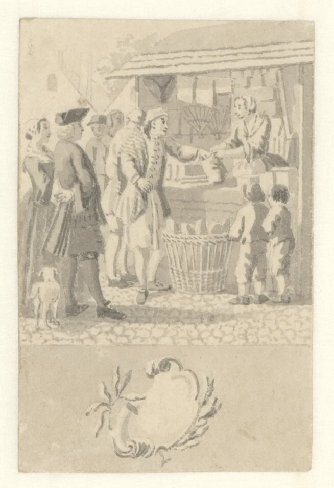 Het loterijspel was vooral in de 18de eeuw een populair gezelschapsspel. Het bestond uit drie groepen kaarten met respectievelijk afbeeldingen, spreuken op rijm en prijzen. De eerste groep, de loten, waren versierd met afbeeldingen. Aartman tekende dagelijkse taferelen, soms met een verwijzing naar de loterij, zoals Zittende vrouw met drie kinderen bij een kruiwagen met loterijbord (zie cat. nr. 1i), of naar instellingen die indirect met het kansspel zijn verbonden, zoals Drie mannen in gesprek bij de Munt (cat. nr. 1tt) en Man voor de deur van de Bank van Lening (cat. nr. 1ww).