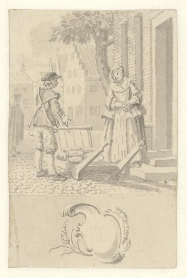 Ontwerpen voor de zestig kaartjes van een loterijspel (Man met kruiwagen en vrouw voor een huisdeur), 1740 - 1760