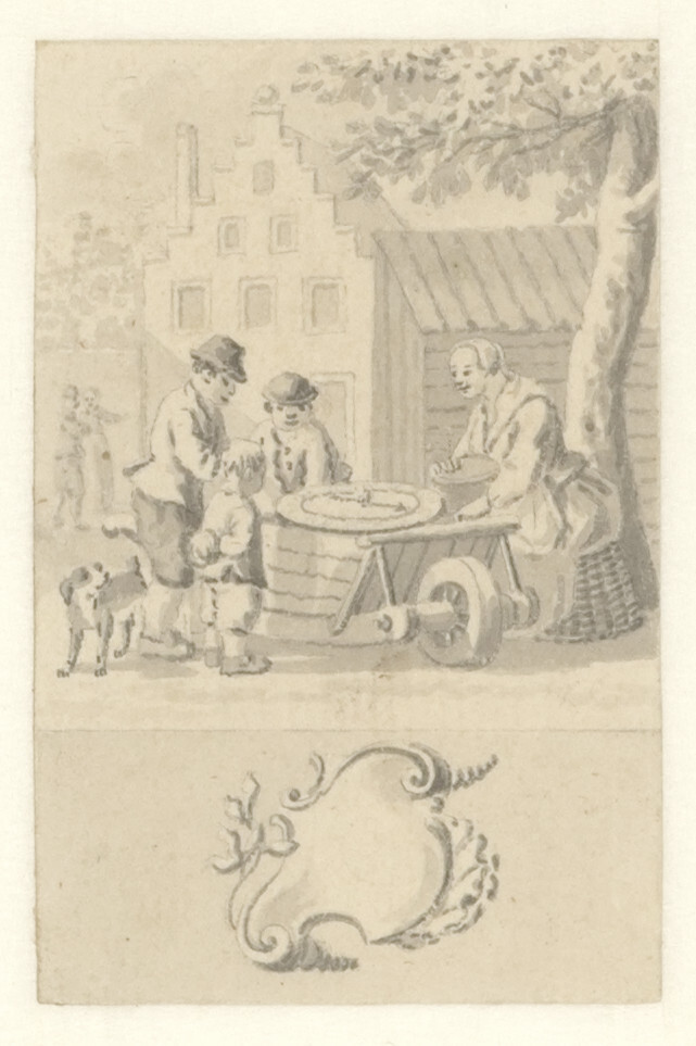 Ontwerpen voor de zestig kaartjes van een loterijspel (Zittende vrouw en drie kinderen bij een kruiwagen met loterijbord), 1740 - 1760 Amsterdam papier, potlood, waterverf hoogte: 7.5 cm; breedte: 4.9 cm; opschrift op achterzijde oud opzetvel: :C:A: Coeb...(?) 10¼