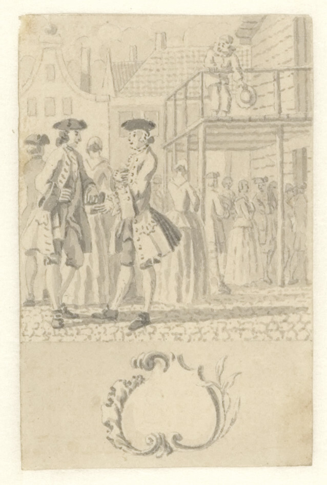 - Ontwerpen voor de zestig kaartjes van een loterijspel (Straattafereel met rij mensen en twee mannen in gesprek), 1740 - 1760