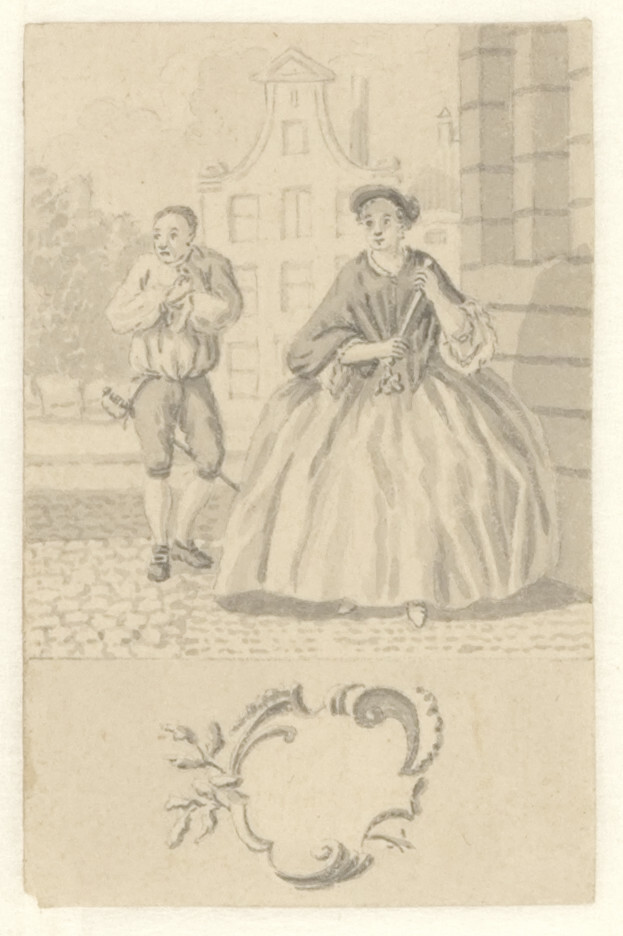 - Ontwerpen voor de zestig kaartjes van een loterijspel (Op straat lopende man en vrouw), 1740 - 1760