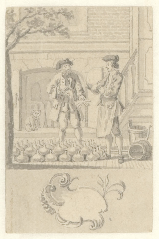 - Ontwerpen voor de zestig kaartjes van een loterijspel (Twee mannen in gesprek bij flessen voor een wijnkelder), 1740 - 1760