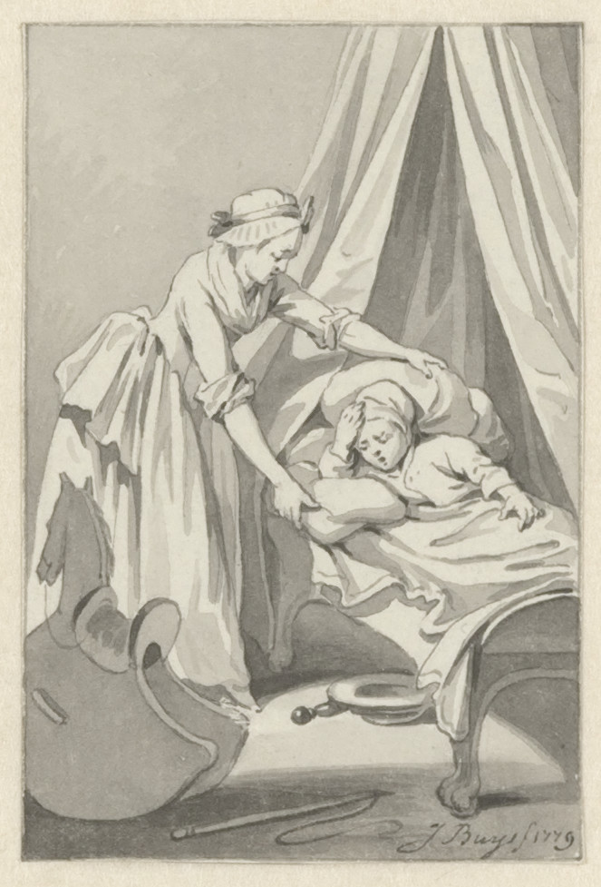 Veiling Cornelis van Stroo, Alkmaar, 29 juli 1811 e.v.d., Kunstboek P: 'Inhoudende 44 stuks Teekeningen, met den Titel; allen met de Pen en O.I. inkt door Jacobus Buys behorende tot de Kindergedichten van J. van Alphen' en 'Ook nog 24 stuks Teekeningen tot onderscheidene Werken behoorende, allen met O.I. inkt door zoo Evengemelde Meester [Jacobus Buys].';Aankoop 1985 (van E.H. Ariëns Kappers, Amsterdam, zogenaamd als afkomstig uit de collectie van Cornelis Schoon (1719-1778), Broek in Waterland, gehuwd met Neeltje Pater)