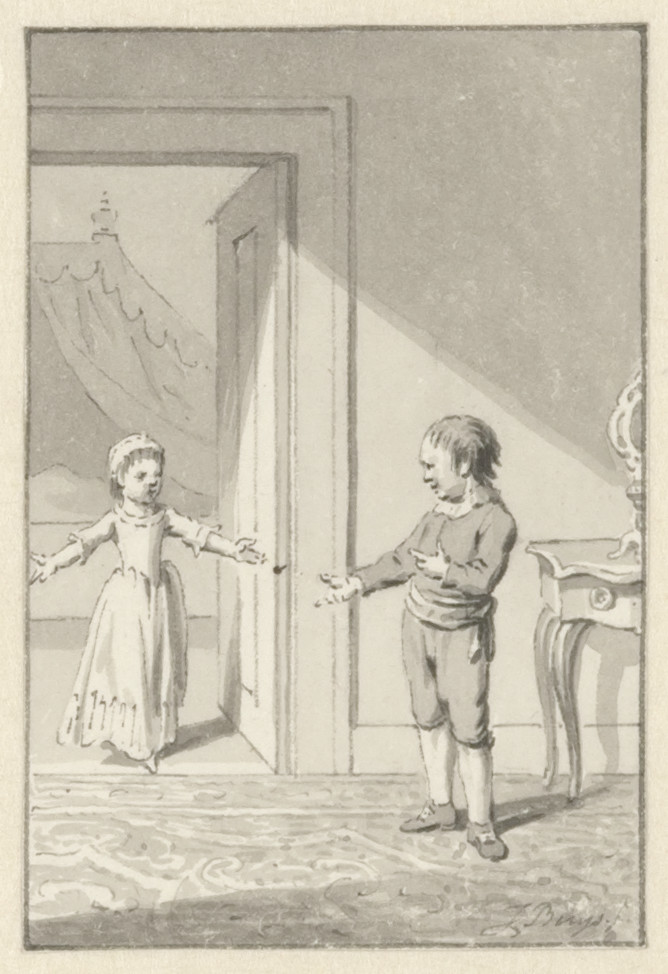 Veiling Cornelis van Stroo, Alkmaar, 29 juli 1811 e.v.d., Kunstboek P: 'Inhoudende 44 stuks Teekeningen, met den Titel; allen met de Pen en O.I. inkt door Jacobus Buys behorende tot de Kindergedichten van J. van Alphen' en 'Ook nog 24 stuks Teekeningen tot onderscheidene Werken behoorende, allen met O.I. inkt door zoo Evengemelde Meester [Jacobus Buys].';Aankoop 1985 (van E.H. Ariëns Kappers, Amsterdam, zogenaamd als afkomstig uit de collectie van Cornelis Schoon (1719-1778), Broek in Waterland, gehuwd met Neeltje Pater)