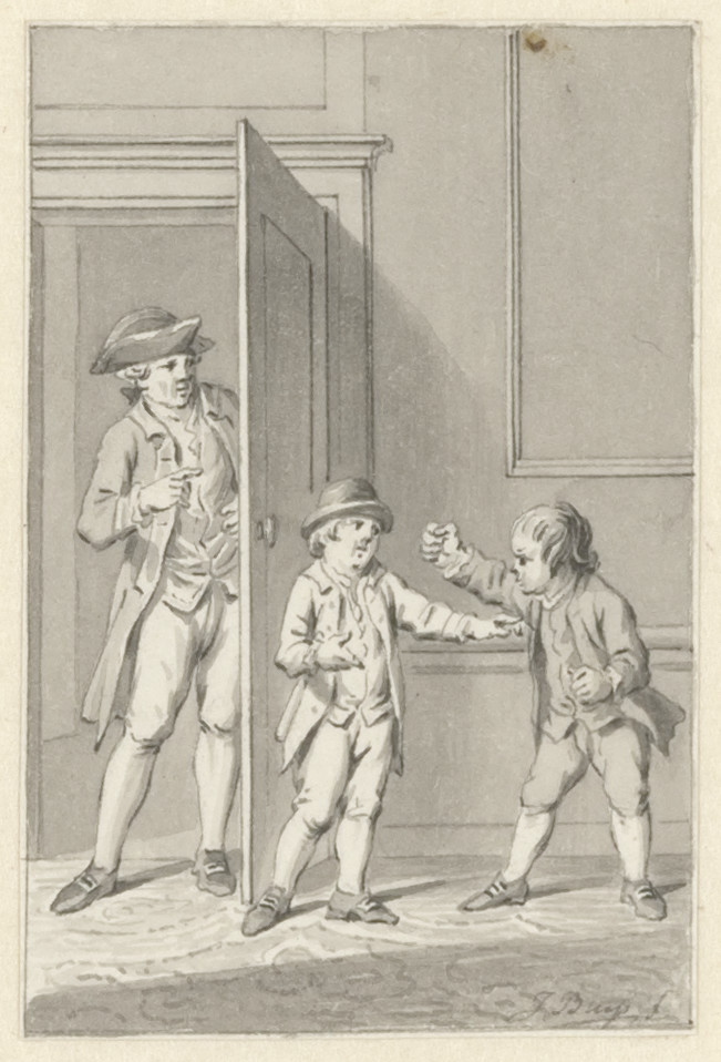 Veiling Cornelis van Stroo, Alkmaar, 29 juli 1811 e.v.d., Kunstboek P: 'Inhoudende 44 stuks Teekeningen, met den Titel; allen met de Pen en O.I. inkt door Jacobus Buys behorende tot de Kindergedichten van J. van Alphen' en 'Ook nog 24 stuks Teekeningen tot onderscheidene Werken behoorende, allen met O.I. inkt door zoo Evengemelde Meester [Jacobus Buys].';Aankoop 1985 (van E.H. Ariëns Kappers, Amsterdam, zogenaamd als afkomstig uit de collectie van Cornelis Schoon (1719-1778), Broek in Waterland, gehuwd met Neeltje Pater)