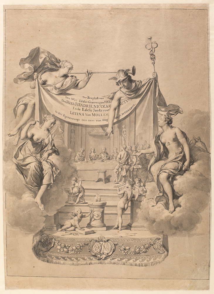 Bij de tekening worden twee handgeschreven gedichten bewaard: een 'voorrede aan de lezer' (cat. nr. 178a) en een 'uitlegging van de beelden' (cat. nr. 178b). Bruiloftsgedichten, in velerlei vormen, waren een belangrijk onderdeel van de feestelijkheden rondom huwelijken in de 18de eeuw. De voorrede in dichtvorm werd als eerste voorgedragen. Aan het slot daarvan werd de monumentale tekening onthuld. De gedichten werden vaak gedrukt en soms voorzien van een fraaie titelprent. Die konden aan de gasten worden meegegeven als herinnering aan de bruiloft. Het grote formaat van deze tekening doet vermoeden dat de voorstelling bedoeld was om aan de muur te hangen. Na de onthulling van de tekening was het tweede gedicht aan de beurt. Dat geeft uitleg over de allegorische voorstelling. Het bevat een aantal elementen, die volgens een vast patroon voorkwamen in bruiloftspo‰zie. Zo werden de goede eigenschappen van het bruidspaar bezongen en een toespeling gemaakt op de nakomelingen. Ook de vader van