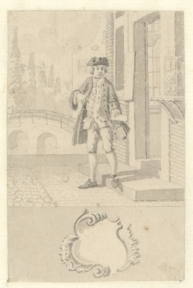 Ontwerpen voor de zestig kaartjes van een loterij spel (Stadsgezicht met een man met een papier in de hand voor een winkeldeur), 1740 - 1760 Amsterdam papier, potlood, waterverf hoogte: 7.5 cm; breedte: 4.9 cm; opschrift verso: 15