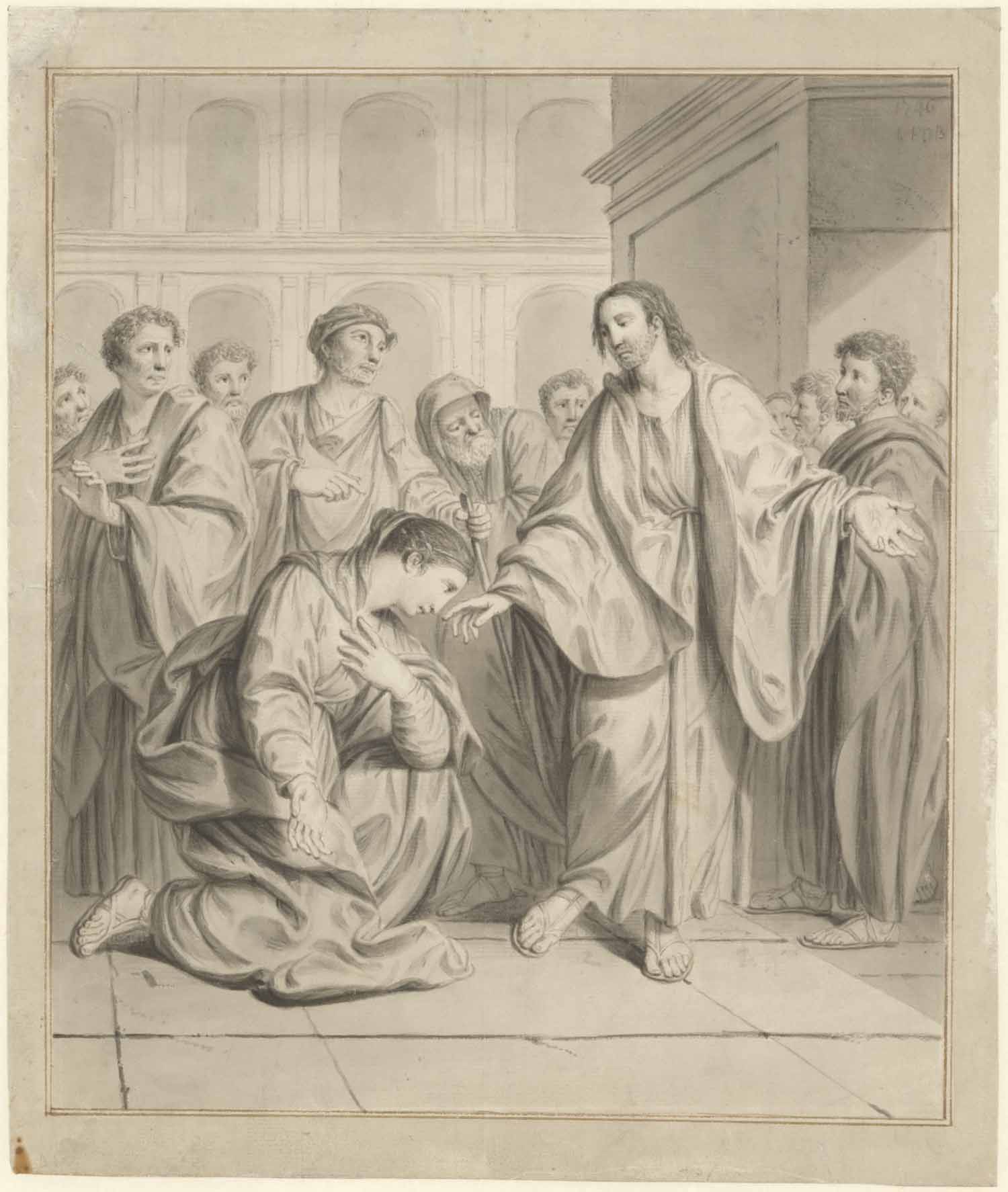 Dubourg tekende hier het verhaal van Christus en de overspelige vrouw (Joh. 8:2-11). De Farizee‰n brachten een op overspel betrapte vrouw naar Christus om hem zijn oordeel te vragen. Volgens de joodse wet zou de vrouw gestenigd moeten worden, maar de Romeinse autoriteiten hadden de joden het recht op de doodstraf ontnomen. De listige Farizee‰n gingen ervan uit dat wat Jezus' oordeel ook zou zijn, het in strijd was met ¢f de joodse ¢f de Romeinse wet. Christus was hierop bedacht en antwoordde dat wie zonder zonde was, de eerste steen mocht werpen. Dat wilde niemand en Christus vergaf de vrouw en zei: 'Ga heen, zondig van nu af niet meer'.