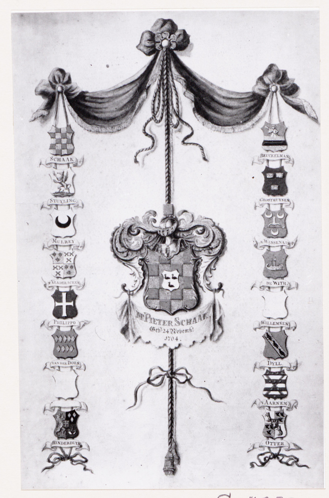 Kwartierstaat van mr. Pieter Schaak geb. 1704. 16 kwartieren, 1700 - 1799 papier, glas, vetkrijt, krijt, gekleurd krijt hoogte: 45.5 cm; breedte: 31 cm; bruikleen 1954-06-16 inv.nr. TB 2583 in depot Herkomst Bruikleen Backer Stichting, Amsterdam, 1954.