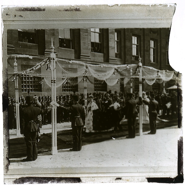 - Vijftien toverlantaarnplaatjes (Koningin Wilhelmina in vol ornaat op weg naar kroningsplechtigheid in Nieuwe Kerk), 1898