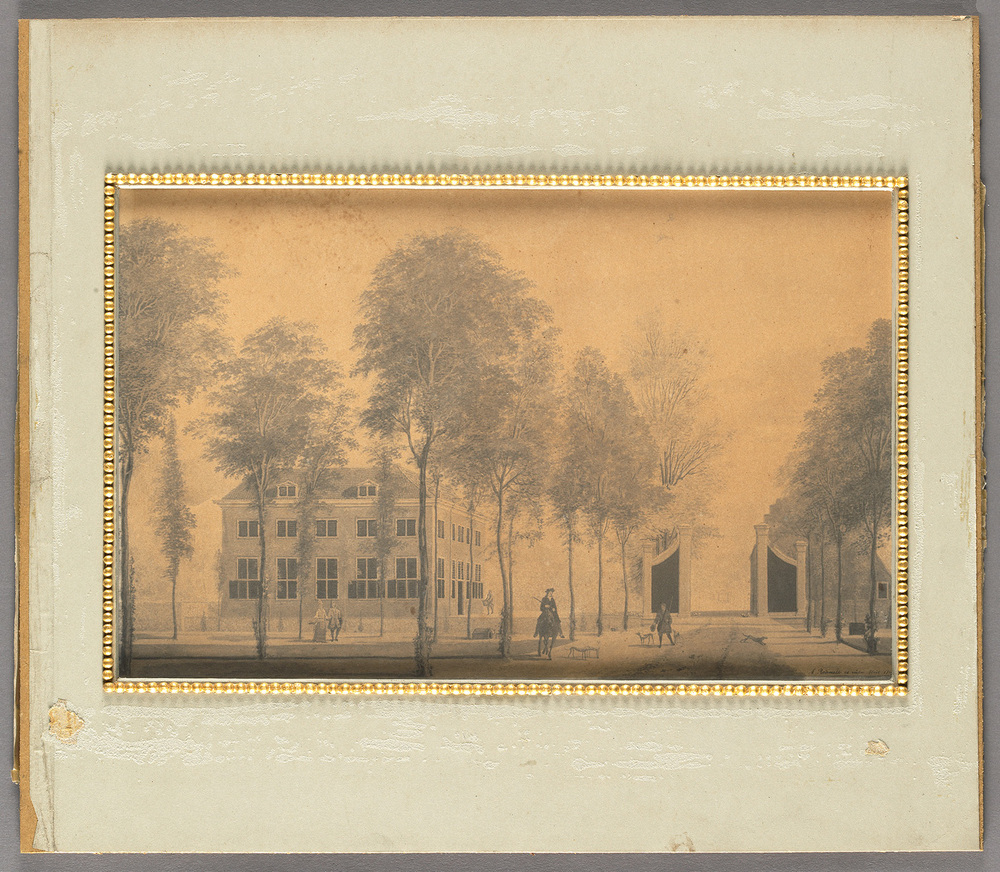 tekst achterzijde lijst, op papier vastgezet met vier rode: Op de oorspronkelijke teekening staat A. Rademaker ad vivum fecit 1714/De heer en dame zijn waarschijnlijk M: Jan Backer en zyne huisvrouw Ana Catharina ten Grootenhuis. Hij was de oudste zoon van Catharina Raye die in 1712 gestorven was en die Nuyssenburg krachtens het legaat van haar man, Cornelis Backer, waarschijnlijk bewoond heeft./De jonge man te paard is vermoedelijk M: Cornelis Backer, eenige zoon van Jan Backer - ten Grootenhuis, die in 1714 22 jaren oud was./In 1720 trouwde hy met Margaretha Bicker./In 1749 is Nuyssenburg gesloopt, dus na den dood van M: Jan Backer die in 1748 overleed. Zyn zoon Cornelis was toen bezitter van Sandenhoef (?) en was blykens z(yn) Kasboek een groot jachtliefhebber.