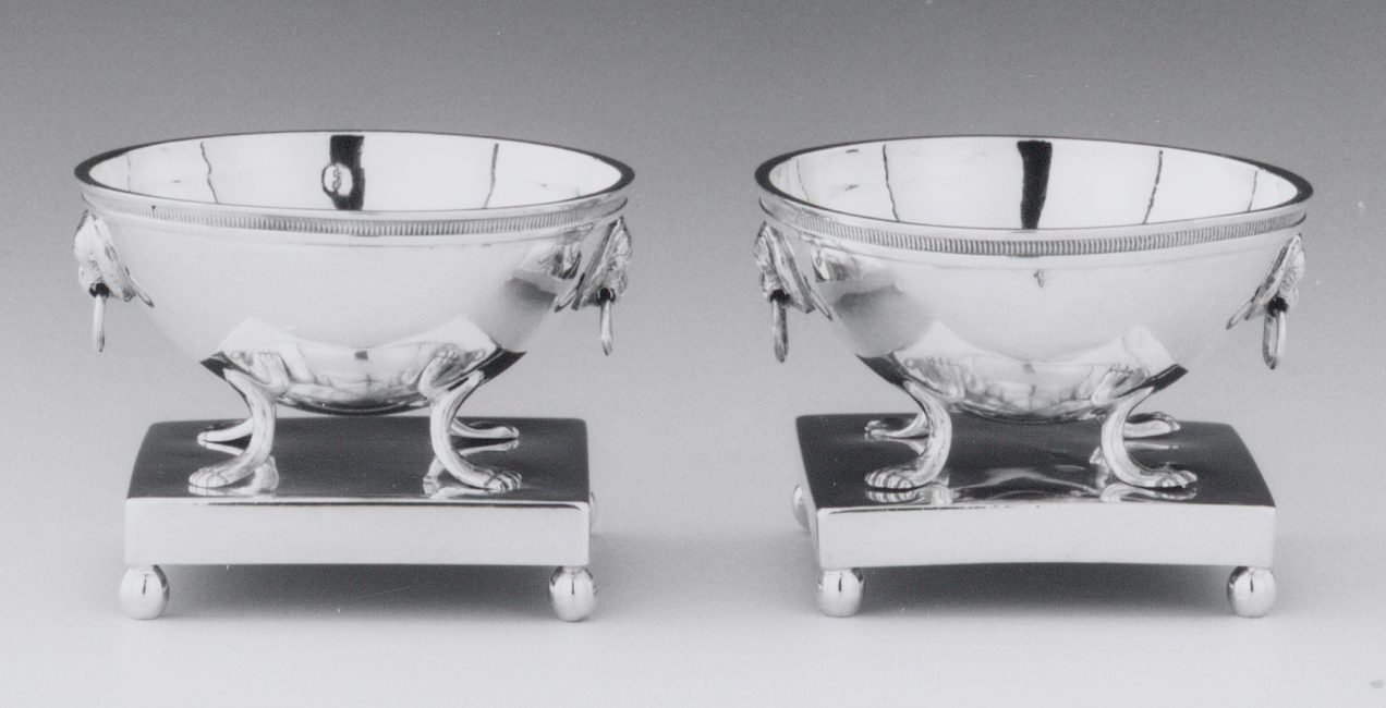 Twee zoutvaten, elk met vierkant voetstuk op vier bolvormige poten en komvormig vaatje op vier klauwpoten. Aan weerszijden vat een leeuwenmasker met ringetje, als grepen dienend. Geribde band tussen gladde randen langs bovenrand. Binnenzijde vaatje verguld. Op onderzijde voetstuk in graveersteek: V/ (KA 5487) en: VIII/ (KA 5488).