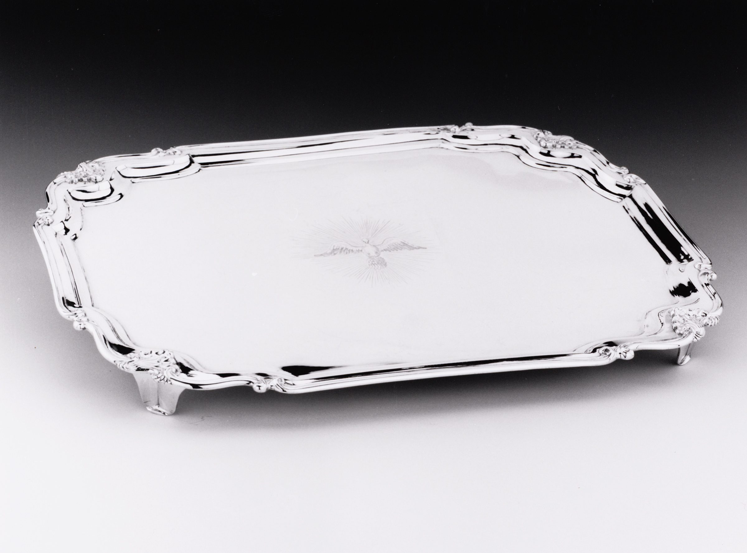 Bladen als deze deden dienst als schenk- en presenteerbladen. Vanaf het midden van de achttiende eeuw waren ze de specialiteit van menig grootwerker. Zie voor twee zeer verwante vierkante bladen door Hendrik Swierinck uit 1758: cat.nrs. KB 2332-KB 2333.
