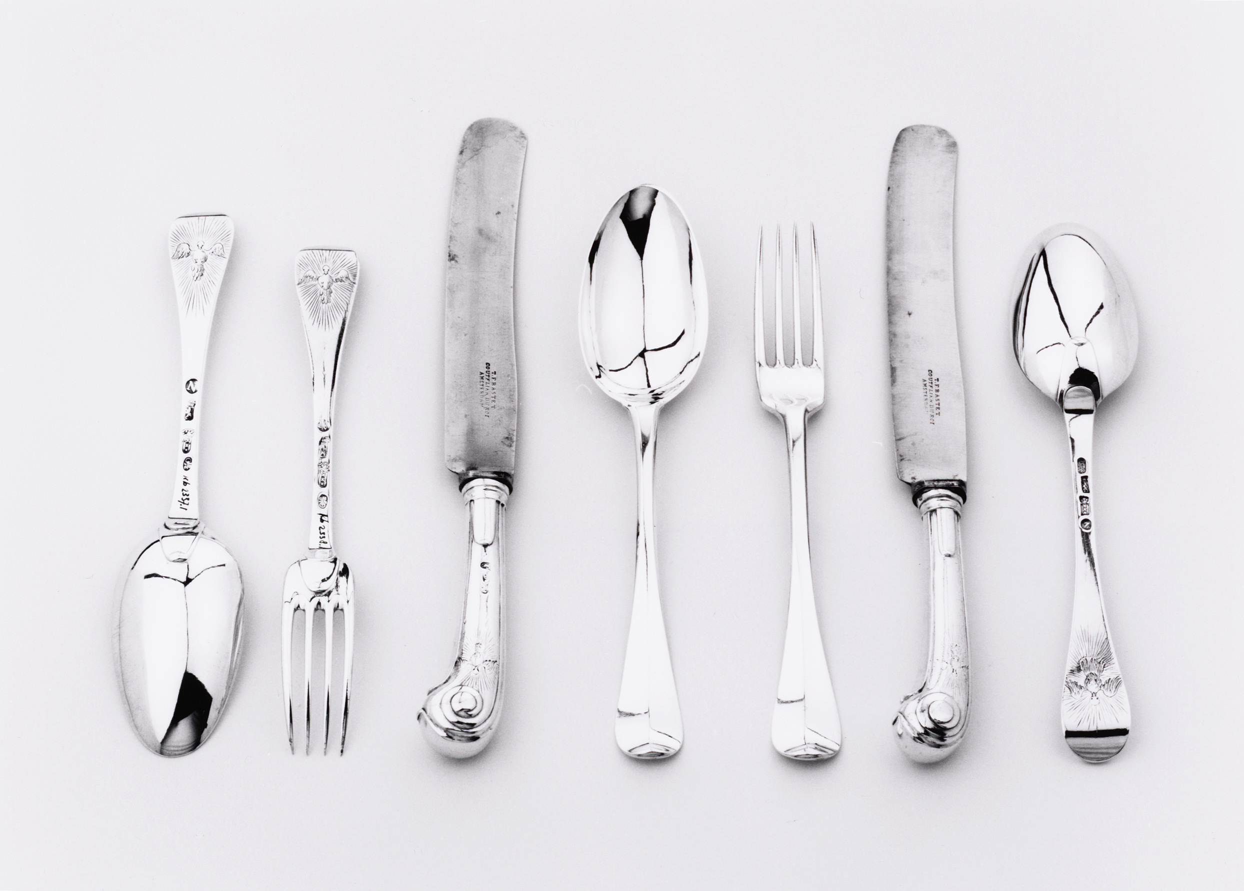 Tafelcouverts, steel met middenribbe en ronde opstaande kop, ovale lepelbak en dubbel Amsterdams lof. Messen met zilveren pistoolheft en vroeg negentiende-eeuws spatelvormig lemmet van staal. Op onderzijde van alle stelen en op heften is een duif in een stralenkrans gegraveerd, symbool van de Heilige Geest en embleem van het Burgerweeshuis. Lepels, vorken en messen afzonderlijk geborgen in drie rechthoekige kisten met scharnierend deksel. Kisten van loofhoutceder, ingelegd met biezen van purperhart, elk twee C-vormige handgrepen en sleutelplaat van koper, gedeeltelijk verguld. Interieur bekleed met groen laken. Sleutels ontbreken.