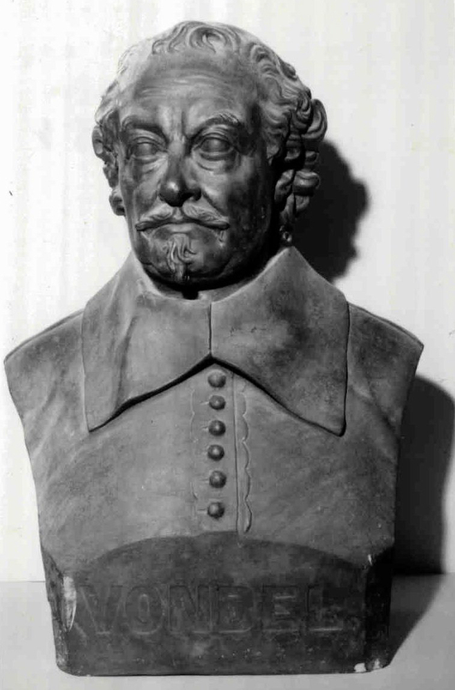 Gegoten en gebronsd beeld van oudere man met snor en sikje, het hoofd iets naar rechts gewend. Gekleed in wambuis en hemd met brede platte kraag en op de krullende haren een kalot.