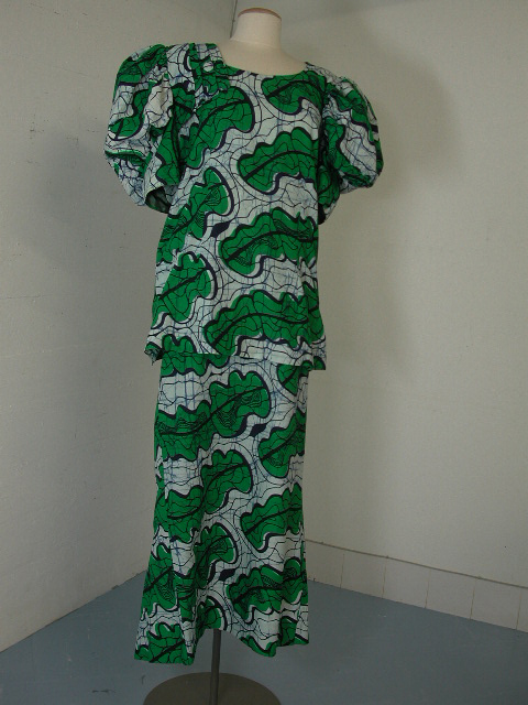 Dit is een van twee jurken die zijn gemaakt t.g.v. de oprichting van I Care, in 1992 en t.g.v. het vijfjarig bestaan van de stichting in okt. 1997. De kleding is gemaakt van groen en witte stof, de kleuren van I Care. De kleuren hebben de betekenis 'Go Ahead'. Stichting I Care werd opgericht door Grace Yeboah. Deze groep vrouwen bezochten overlevenden van de Bijlmervliegramp; de stichting gaf kosteloos hulp aan mensen die door gemis aan familie ondersteuning nodig hebben.
