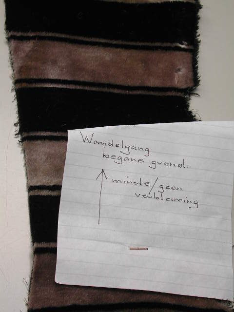 Staal gestreepte trijp, zwart/aubergine, beige. Gebruikt als bekleding voor stoelen in wandelgang op begane grond.- Trefwoorden