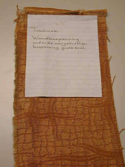 Staal oranje fluweel, wandbespanning, aangetroffen onder bespanning in de grote zaal.- Trefwoorden