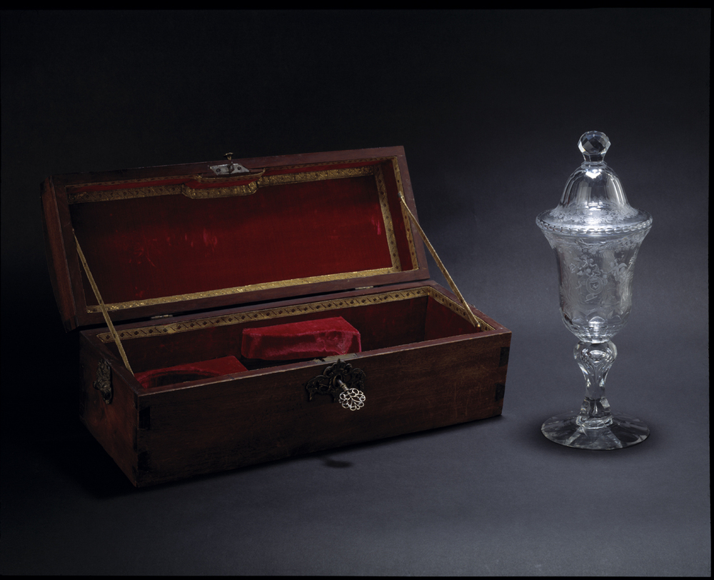 Deze glazen bokaal is gemaakt ter gelegenheid van de vijftigste verjaardag van Jan Gildemeester Jansz. (1744-1799) op 18 april 1794. Gildemeester was koopman en consul van het Portugese koningshuis in de Nederlanden. Het gegraveerde opschrift op het glas refereert aan deze erebaan. Op de achterzijde is een allegorische voorstelling aangebracht met onder meer personificaties van de Tijd en de Voorspoed. Twee kinderfiguurtjes op een wolk houden het gekroonde familiewapen vast. Gildemeester zelf is te zien op het schilderij dat links van deze vitrine hangt. ( Bert Vreeken)