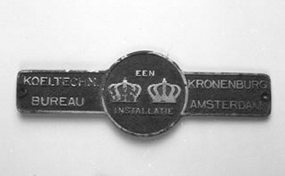 - opschrift voorzijde: EEN/ INSTALLATIE/KOELTECHN./ BUREAU/KRONENBURG/ AMSTERDAM: op het ronde middenvlak twee kronen