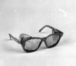 Een z.g. brandbril, wit montuur, beschermkapjes aan de zijkant- Trefwoorden