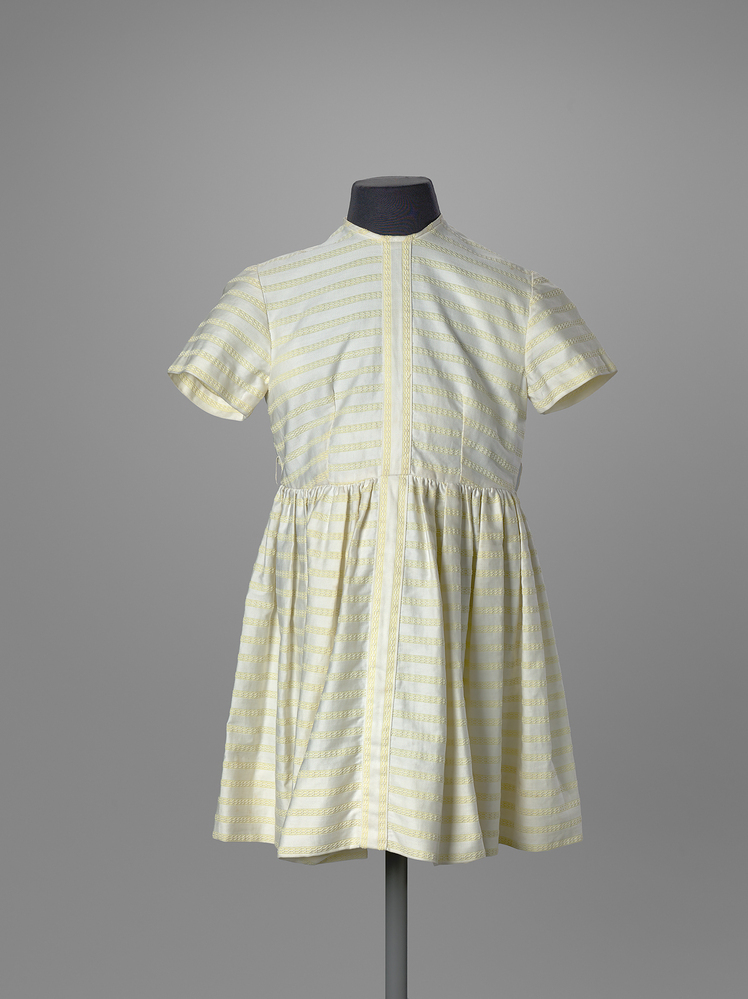 Kraagloos, ingeweven gele streepjes, korte mouw, strak lijfje, aangerimpelde rok. Sluiting midden achter met vier gele knoopjes