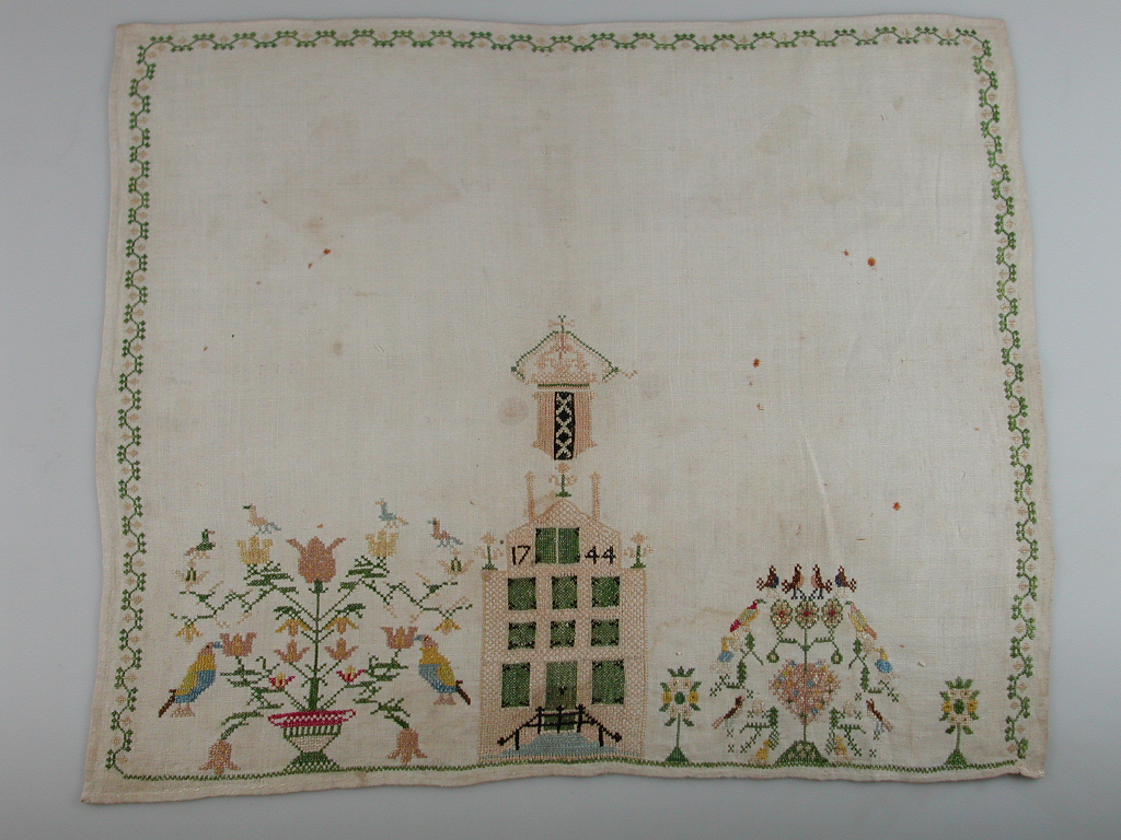 Deze doek uit 1744 draagt het wapen van de stad Amsterdam; enkele decennia voordat Lodewijk Napoleon zich in 1808 in Amsterdam vestigde en de stad hoofdstad werd. De datering werd aangebracht op een grachtenpand met bel-étage, waarvan je er vele ziet in de grachtengordel van Amsterdam. De kans dat de herkomst daarom in deze stad gezocht moet worden is daarmee niet onomstotelijk bewezen, maar wel groot. Meer informatie bevat deze onvoltooide merk- of borduurlap niet. De borduurster is onbekend gebleven. Het jonge meisje koos voor een doek van groot formaat (41,5 bij 49 cm). Ze gebruikte zijden garen op een linnen ondergrond.