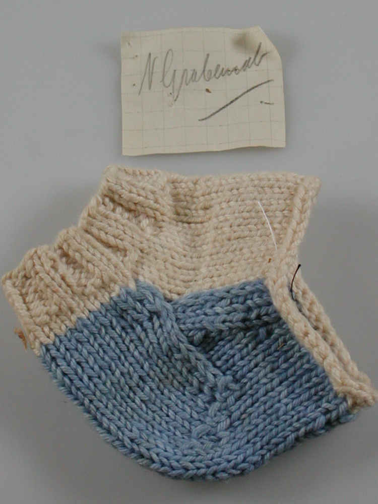 Gebreid hieltje van naturelkleurig/blauw breikatoen. Handwerkproef van mevr. R.A.J. Grabrandt.- Trefwoorden