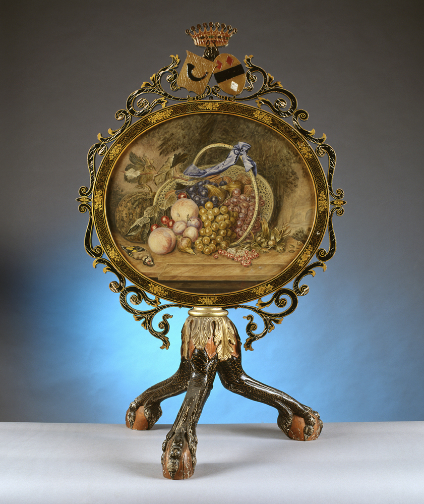 Haardscherm met geaquarelleerd vruchtenstilleven en alliantiewapen.- Trefwoorden