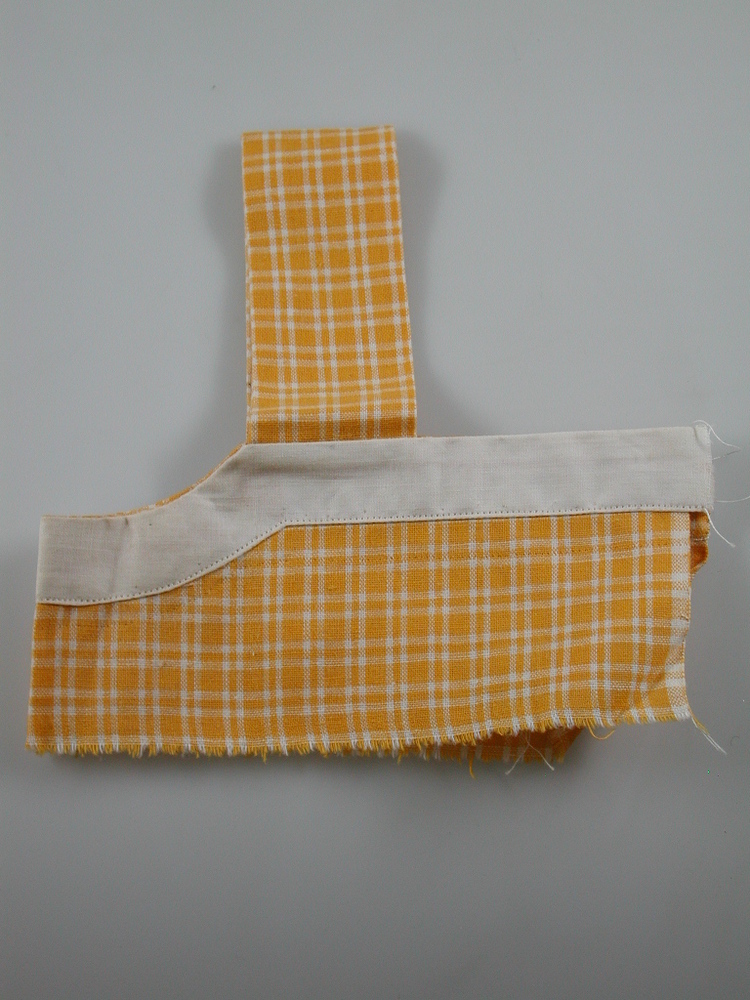 Halsafwerking van geel geruit katoen, met in vorm geknipt stuk witte katoen, bovenstuk met schouderband. Handwerkproef van mevr. R.A.J. Grabrandt.- Trefwoorden
