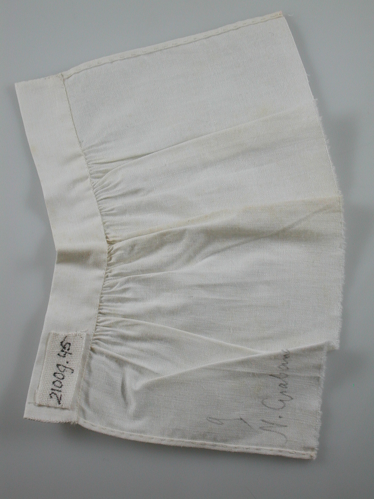 Aangerimpeld wit katoenen lapje op band. Handwerkproef van mevr. R.A.J. Grabrandt.- Trefwoorden