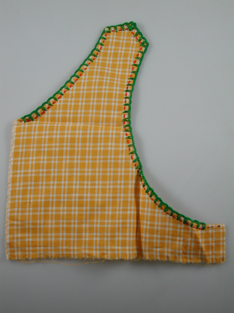 Geel geruit katoenen proeflapje met gehaakte randafwerking in groen en rood. Handwerkproef van mevr. R.A.J. Grabrandt.- Trefwoorden