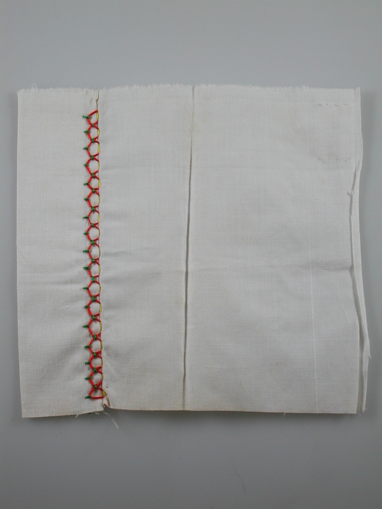 Wit katoenen proeflapje met opgeborduurde sierbandjes in rood, groen en geel. Handwerkproef van mevr. R.A.J. Grabrandt.- Trefwoorden