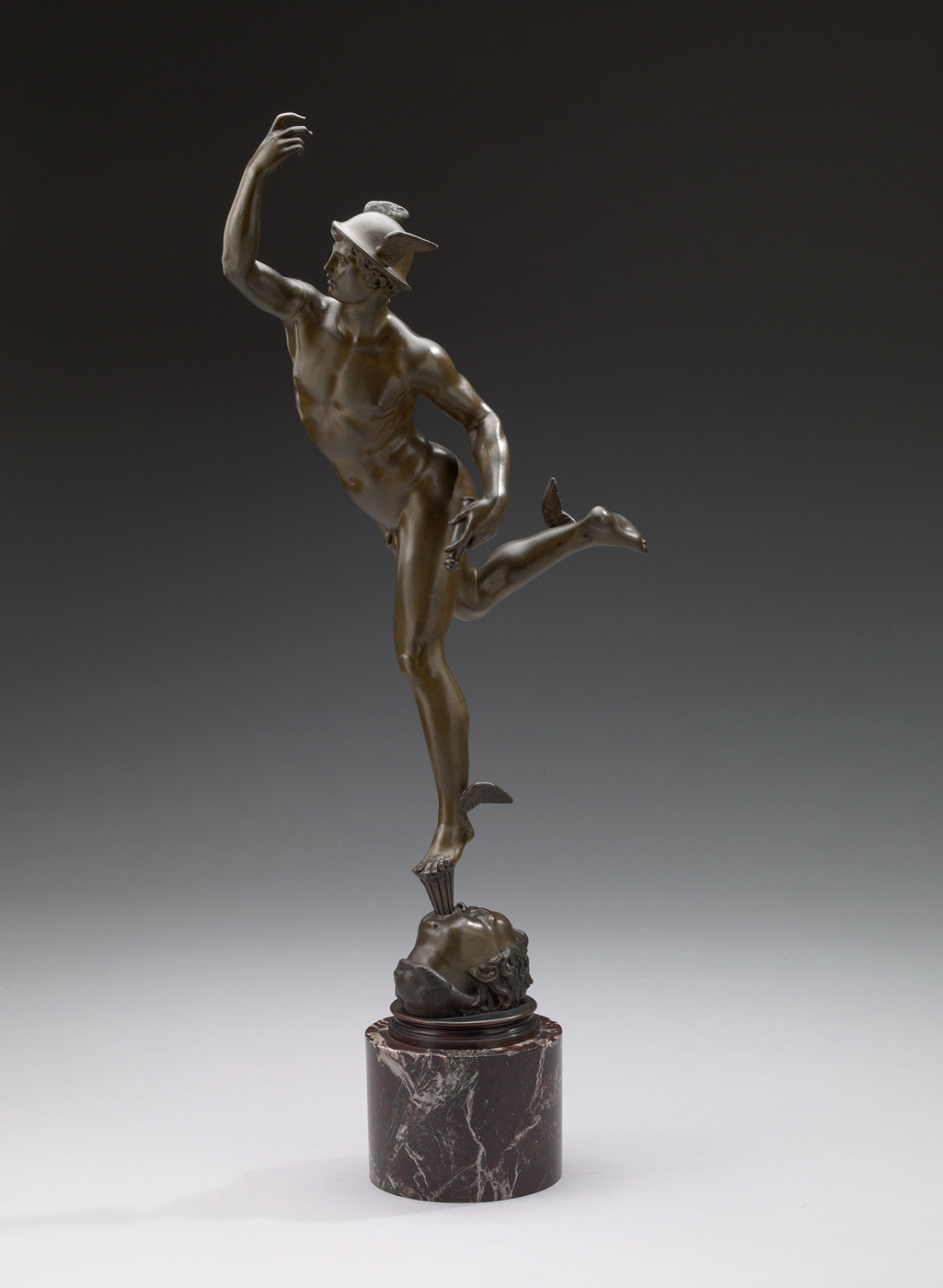 Kopie naar de 'Vliegende Mercurius' door Giambologna (1529-1608) (1588; in Museo Nazionale Bargello te Florence; ander exemplaar in Museo e Gallerie Nazionali di Capodimonte te Napels). Naar dit beeld zijn al tijdens het leven van de kunstenaar kleine replica's vervaardigd. De boodschapper van de Griekse goden is weergegeven staand op het hoofd van Aiolos, die een voor hem gunstige wind doet waaien. ( Mieke van der Wal)