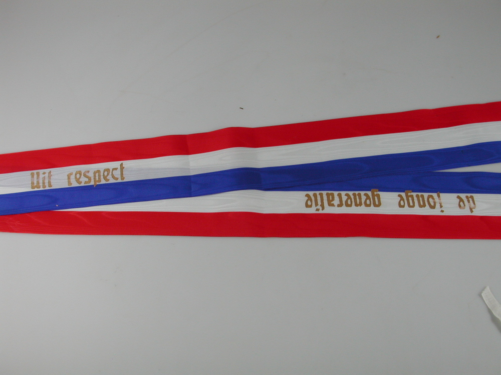 Twee rood-wit-blauwe linten, schuin afgeknipt. Op ene lint in witte middengedeelte bedrukt, met gouden letters: uit respect; op andere lint: de jonge generatie.- Trefwoorden