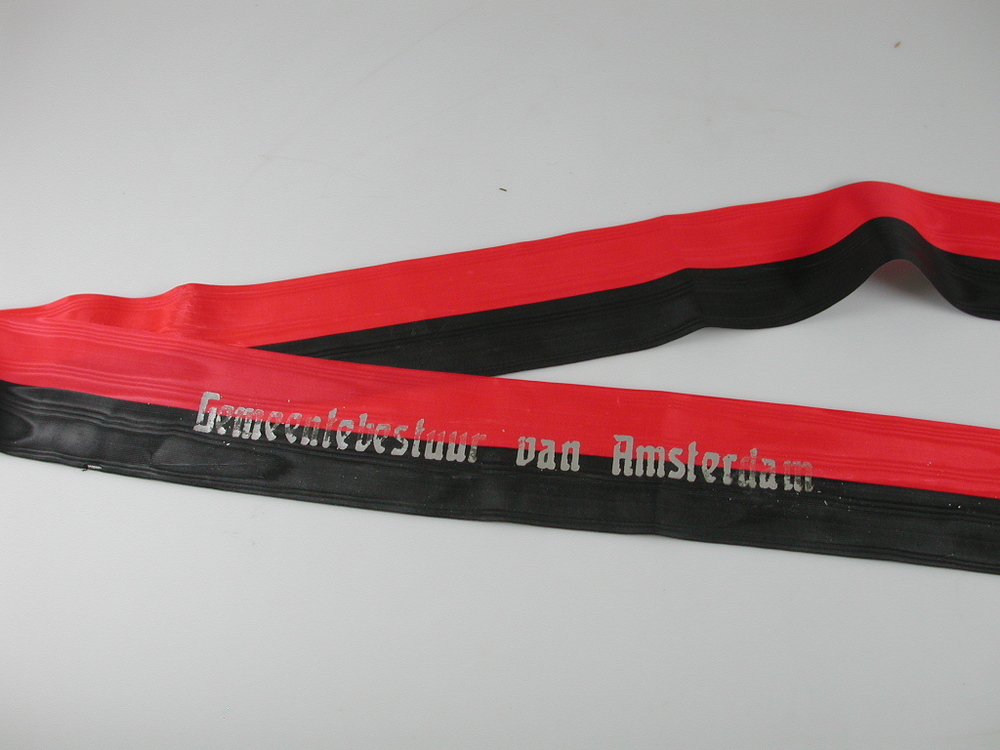 Twee rood-zwarte linten, schuin afgeknipt. Op ene lint in zilverkleurige letters: Gemeentebestuur van Amsterdam.- Trefwoorden