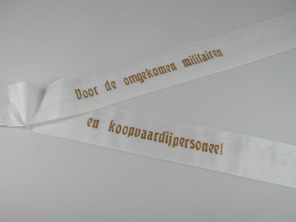 Twee witte linten. Op ene lint in goudkleurige letters: Voor de omgekomen militairen; op andere lint: en koopvaardijpersoneel.