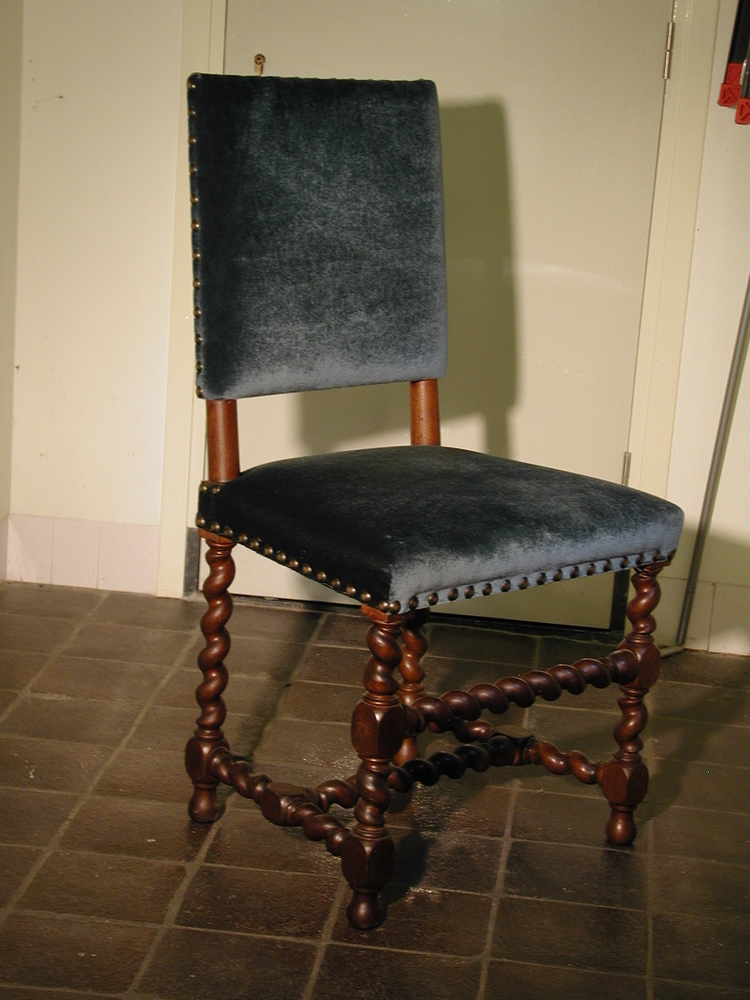 Genre renaissance-/barokstoelen op getorste poten verbonden door eveneens getorste sporten. Vrij rechte rug. Rust op bolpootjes. Vaste stoffering op zitting en rug. Waarschijnlijk een 19de eeuws ensemble, behorend bij tafel (inv.nr KB 2655).