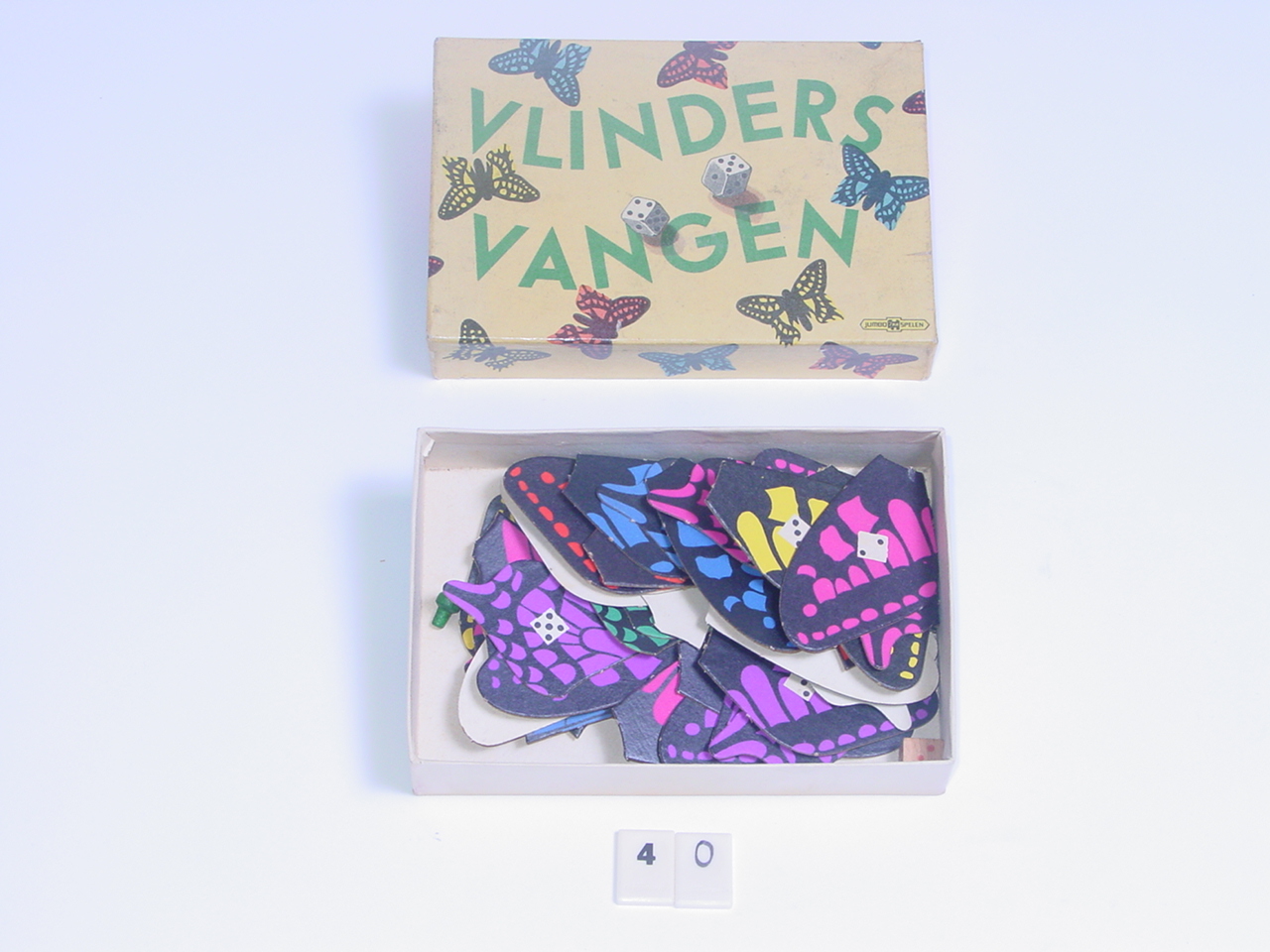 Vlinders samenstellen m.b.v. een dobbelsteen. Variant van Jumbolino. Inhoud van rechthoekige doos met deksel: gekleurde vlinderledematen, dobbelsteen. Handleiding aan binnenzijde van deksel gedrukt.- Trefwoorden