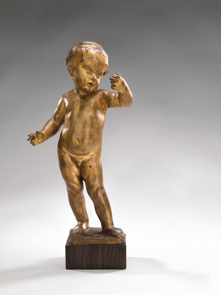 Gebaseerd op een putto door François Duquesnoy, die gezien de talrijke kopieën een grote popuylariteit genoot. Vorm en houding van de putto komen sterk overeen met een verguld bronzen exemplaar, getiteld 'L'amour', in een Parijse verzameling. Deze in een lendendoek geklede putto houdt een boog in de linkerhand en draagt een pijlenkoker over de schouder. ( Michiel Jonker)