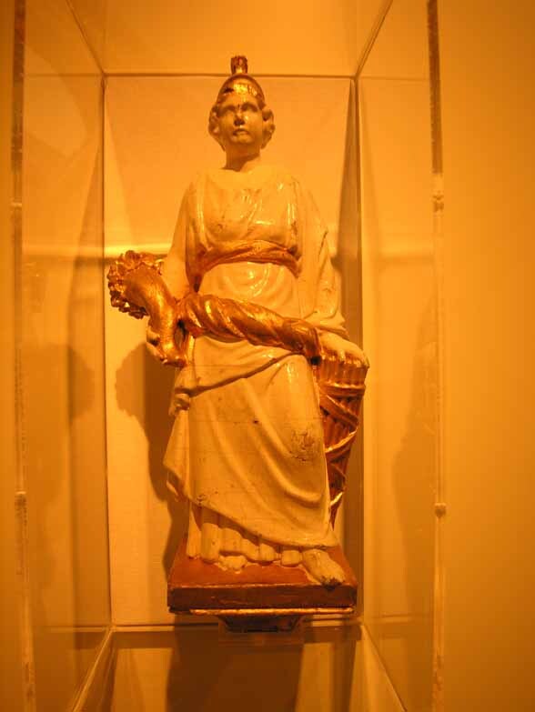 Vrouwenfiguur in klassieke dracht met helm, staand op een vierkant voetstuk. Haar linker hand rustend op een bundel fasces, in haar rechter hand een hoorn des overvloeds houdend. De figuur wit geverfd, met goudkleurige details.